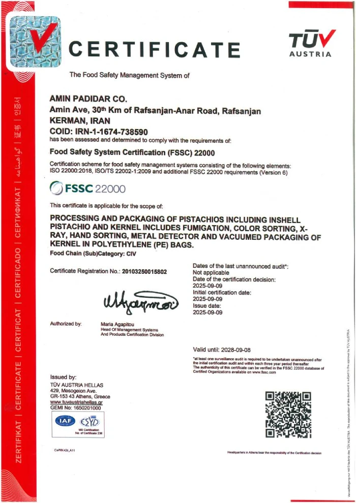 Amin Farms is one of the few pistachio processing plants that has developed its own well-defined and extensive quality specifications and grading standards to meet various market requirements. Our in-house laboratory for testing aflatoxins, pesticide residues, and other contaminants ensures that our products meet international food safety standards. Through expertise, care, and innovation, we provide and supply premium Iranian pistachios trusted by markets worldwide.